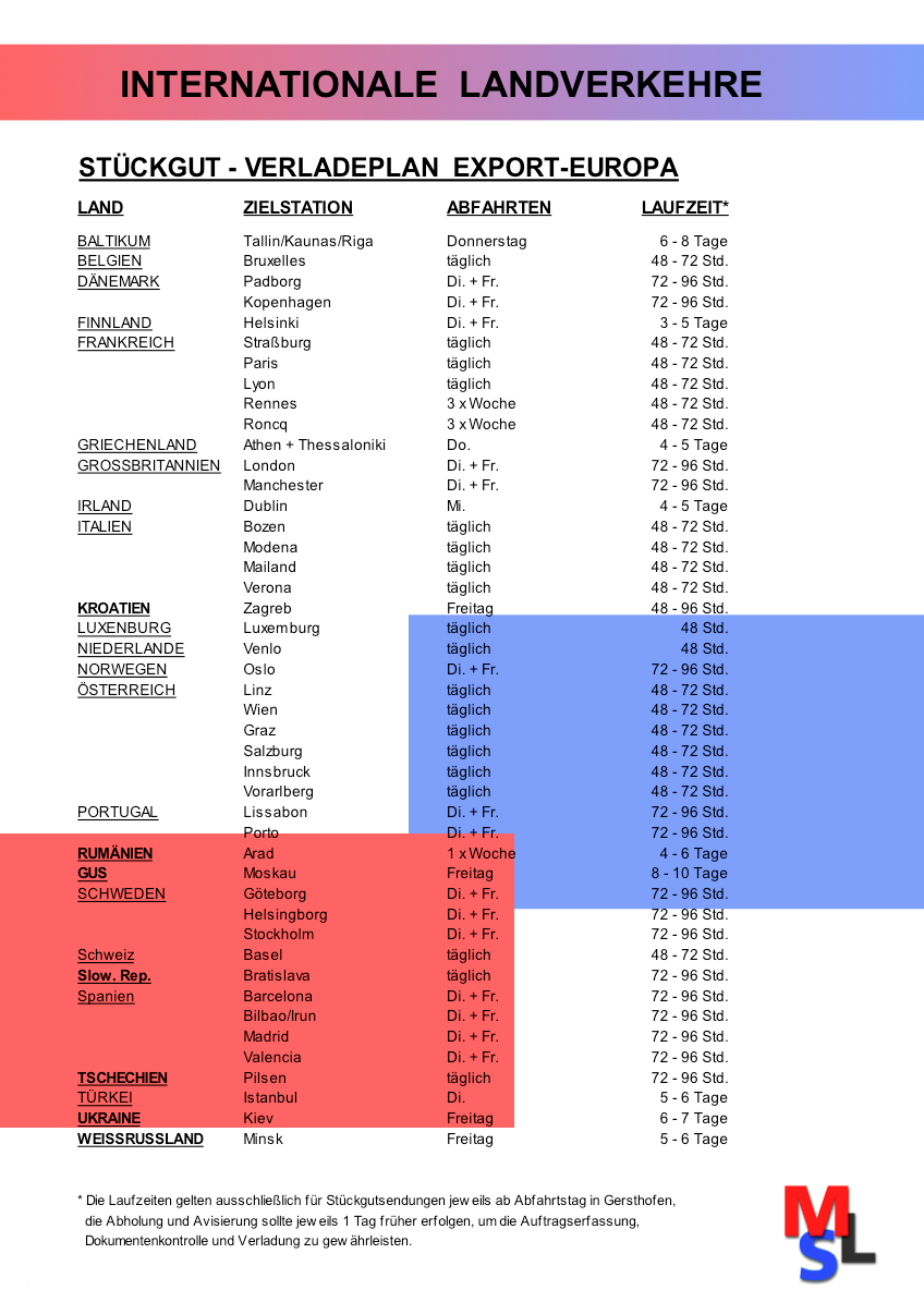 Von Portugal im Westen bis Polen im Osten, oder von Skandinavien im Norden bis nach Griechenland im Süden – durch die ganz gezielt ausgewählten Kooperationspartner Ihrer MSL-Spedition bleibt Ihnen kein Wirtschaftsraum unerschlossen. Greifen Sie auf 110 operative Niederlassungen in 25 europäischen Ländern zurück – Service von Haus zu Haus - schnell, sicher, zuverlässig und pünktlich.